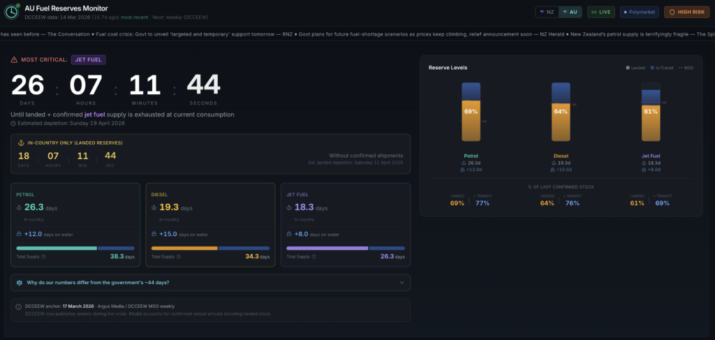 The Prime Minister said over the weekend that (at the time it was said) Australia has 38 days of petrol, 30 days of diesel and 30 days of jet fuel, based on the latest figures available.