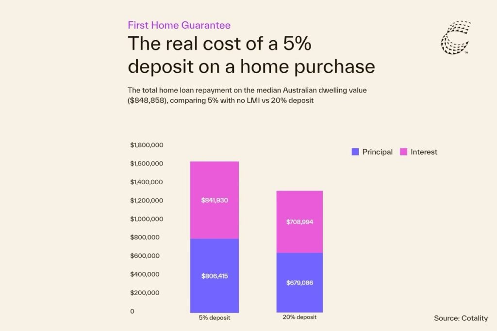 A 5% deposit means taking on a 95% loan-to-value ratio. That extra debt adds up, and over a 30-year loan, “the extra interest costs can be tens-of-thousands, or hundreds-of-thousands more expensive than a 20% deposit home loan.”