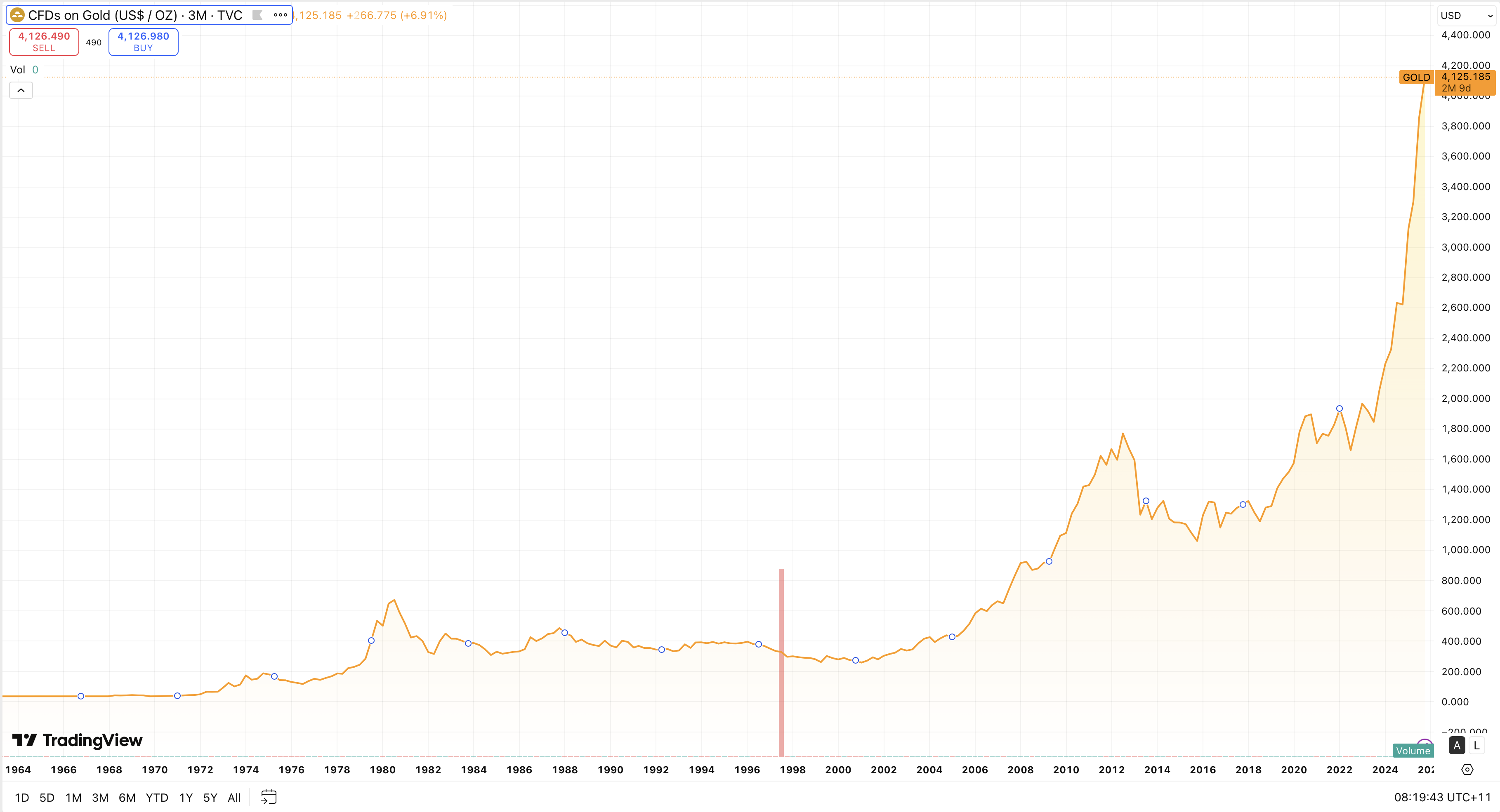 But today's price isn't as high as gold has ever been. That was on Tuesday of this week, when the price almost touched US$4400/oz. Since then, the price has backslid: something we haven't seen it do for almost a decade.