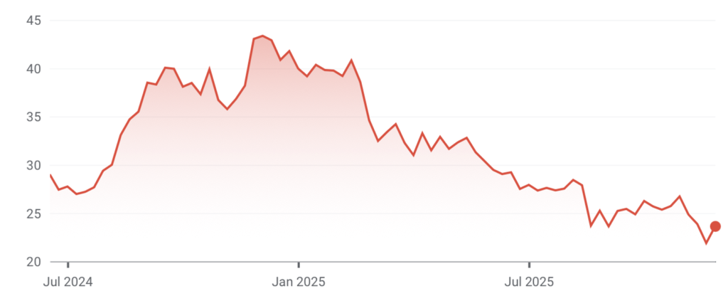 This stock chart of Guzman Y Gomez shows what can happen when you get the expansion path right, even if there are some negative issues currently that explain its lower share price compared to its all-time high. Its share price was $43.35 and it’s now $23.62, after hitting $29 on the day of listing! While the current price isn’t great, GYG has shown how the market can get excited by these food operations when they’re run brilliantly.