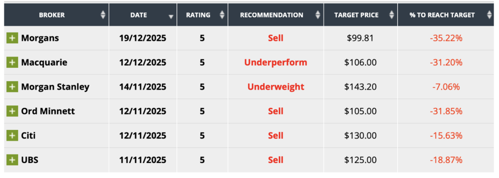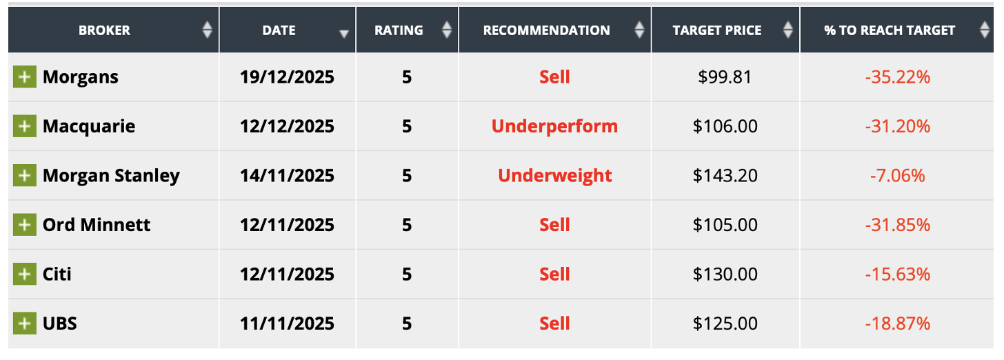 The analysts surveyed by FNArena are still anti-CBA, with the consensus predicting a 23% fall from its current price of $154. I think this is over-the-top but look at the table below.
