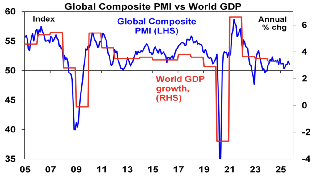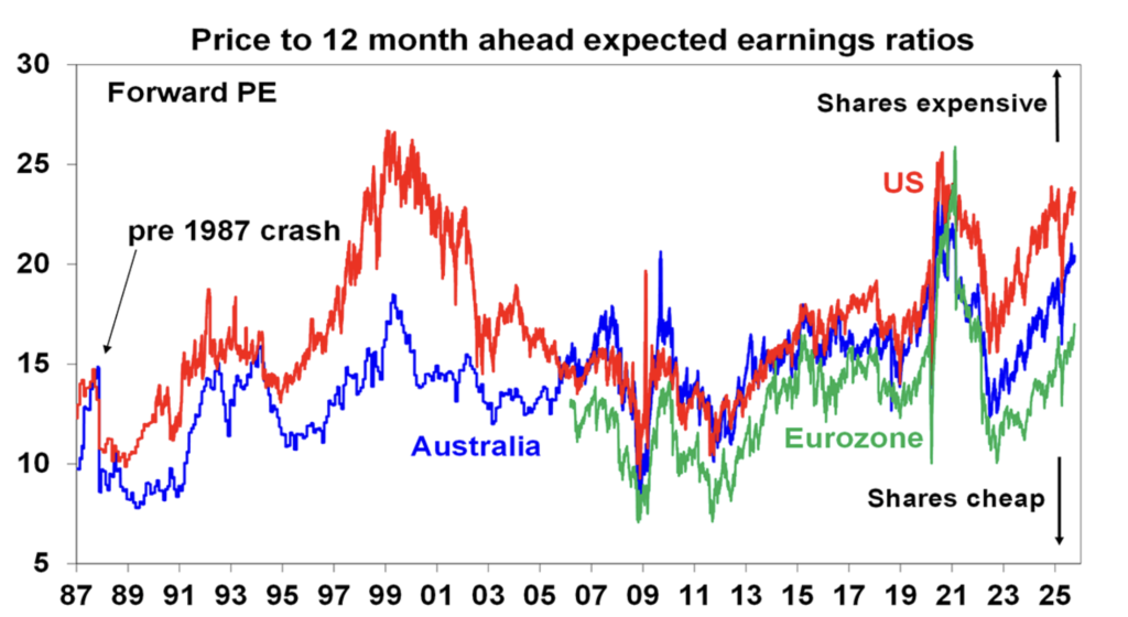 Finally, share markets appear to be disconnecting from a long worry list that includes: uncertainty around US tariffs and their impact; the slowing US jobs market; messy US economic policies and the latest shutdown; uncertainty as to whether the Fed will cut rates as much as the 4-5 cuts the US market is expecting; concern about public debt sustainability in the US, France, UK and Japan; & elevated geopolitical risks particularly with escalating tensions between Russia and NATO and the risk of secondary tariffs on countries importing Russian oil.