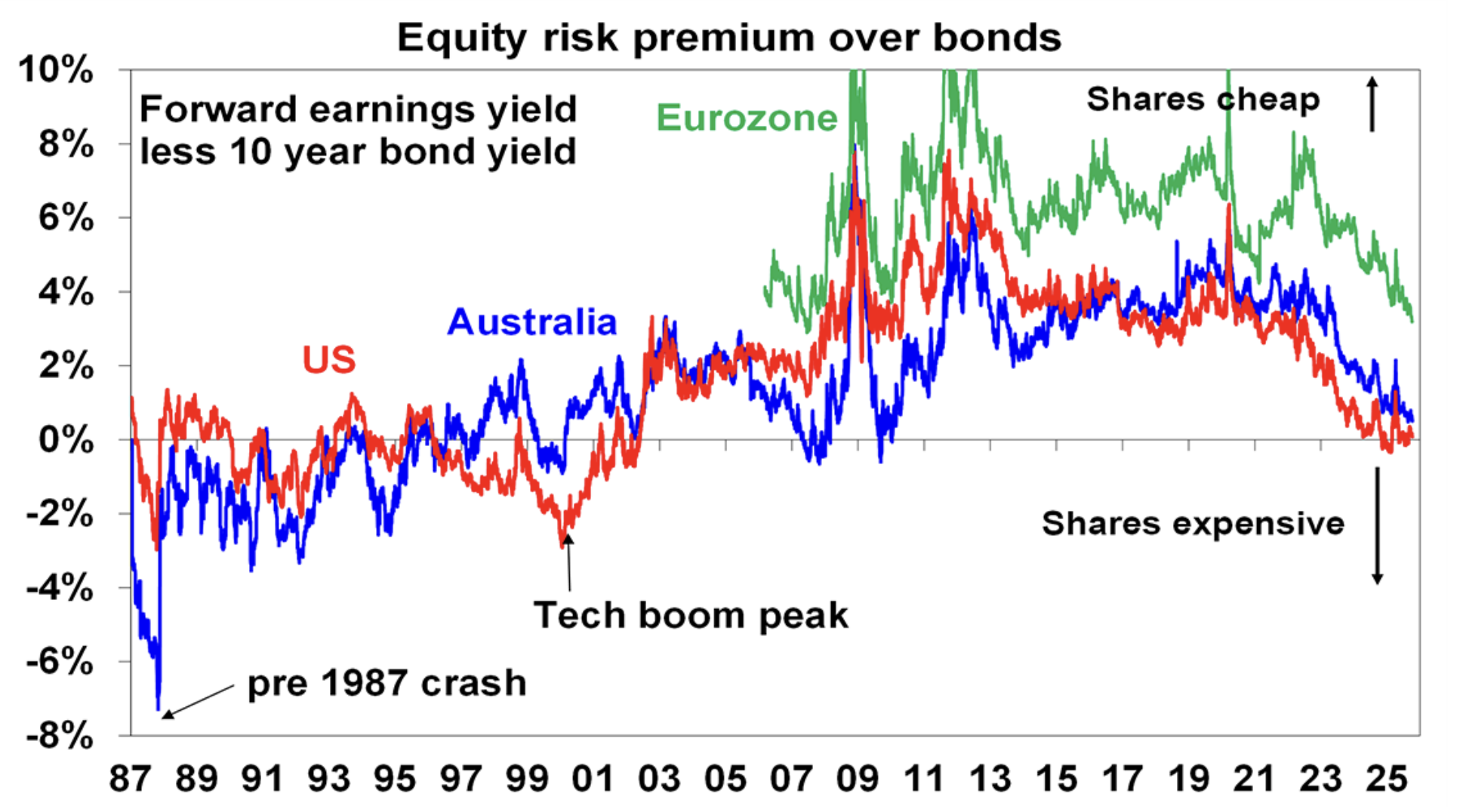 Related to this, the risk premium offered by shares over bonds – the gap between the forward earnings yield (inverse of the forward PE) and the 10-year bond yield - is very low in the US and Australia.
