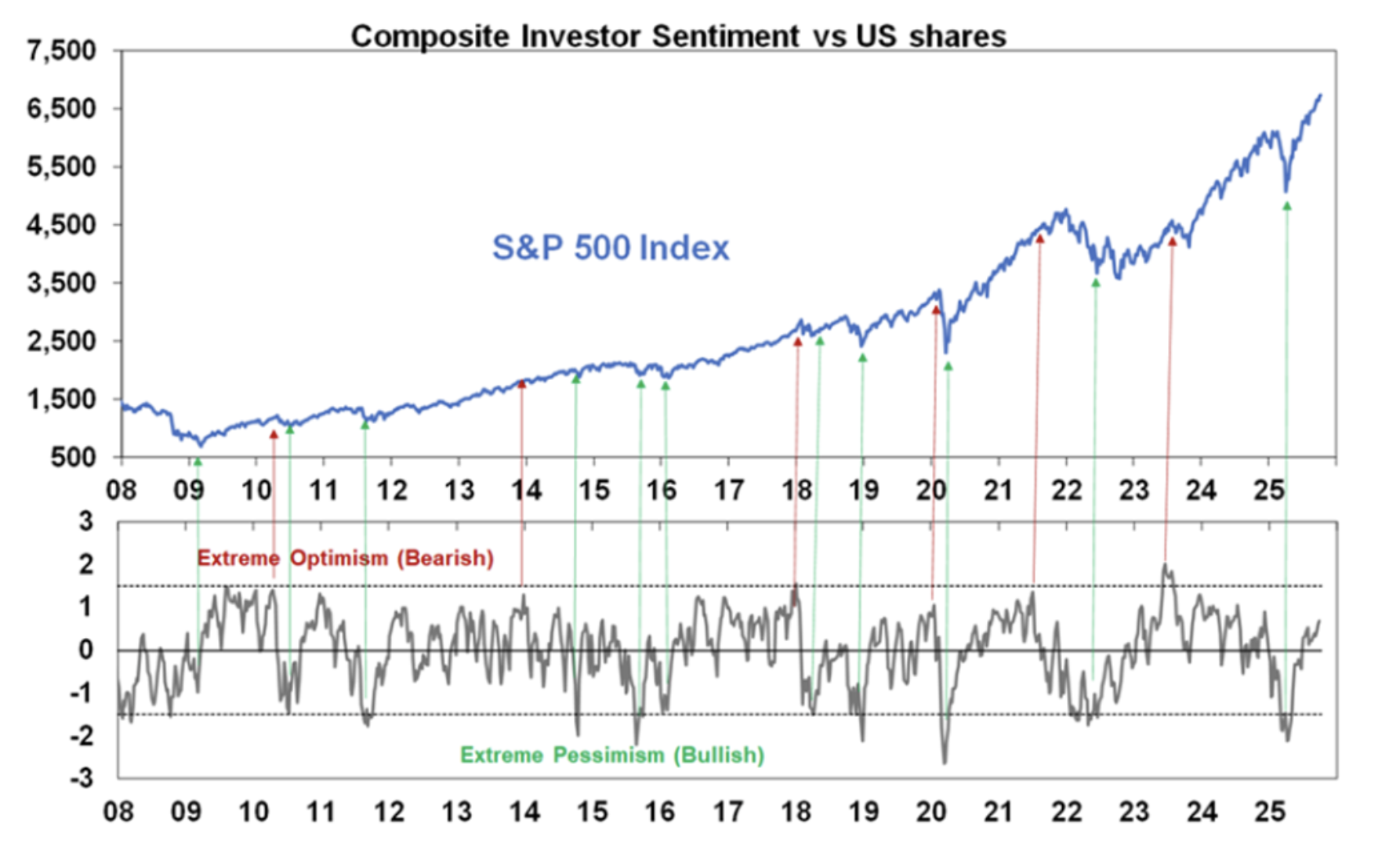 Sixth, measures of US investor sentiment show optimism, but they are arguably not yet indicative of euphoria towards shares that may be associated with a major share market top. See the next chart.
