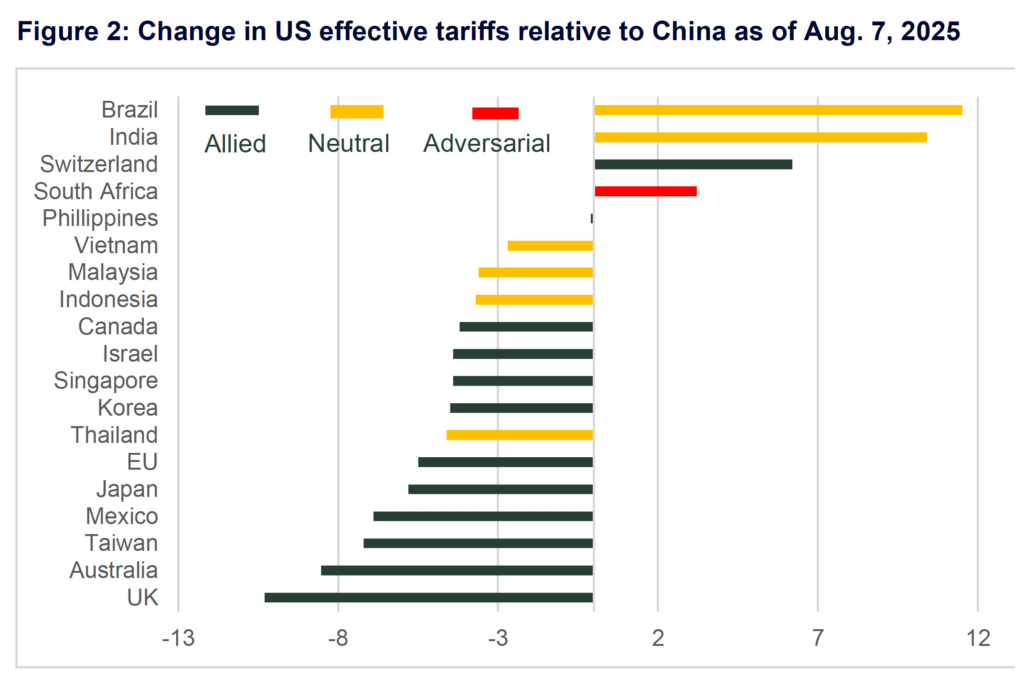 The trade deals outstanding are largely immaterial for the US market. However, they are material for the valuation and outlook of respective local markets, notably, India, Taiwan, and Switzerland. In fact, as Fig. 2 shows, compared to the current effective tariff in place on China, most US allies have greatly improved their competitive position vis-à-vis China. We would therefore also expect the US to eventually conclude trade deals with Switzerland and India before year-end.